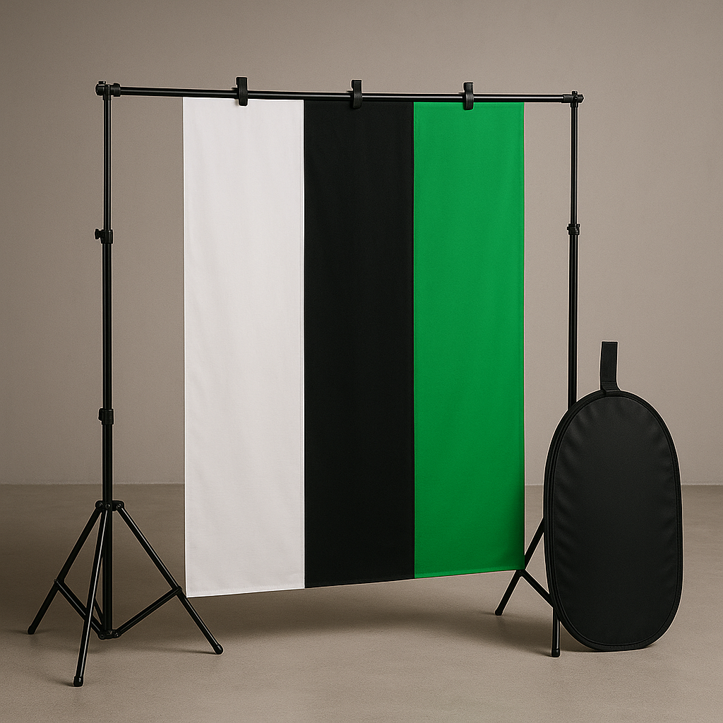 A complete background solution with white, deep black, and chroma-key green fabrics plus an adjustable stand.